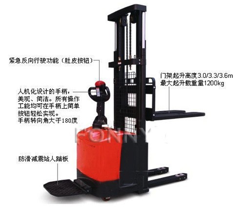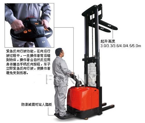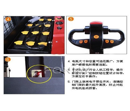 • 緊急反向行駛功能,在向后行駛過程中,一旦操作者背后碰到物體,操作者會自然反應用身體撞擊手柄反向按鈕,車子立即緊急反向行駛,使操作者避免受到傷害。